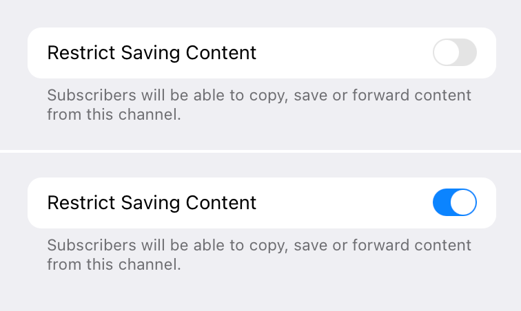 My first thought was: gray text is explaining what the toggle does. But then I read the text and it made no sense: if I _restrict_ sharing, it will allow people to save and forward?