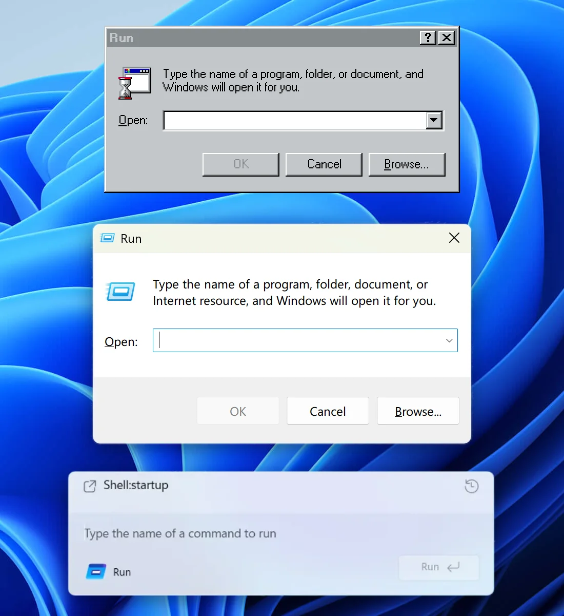 Bottom (Windows 11 Insiders): what am I even looking at? The only shape I can understand here is the Run button. Barely visible, though.